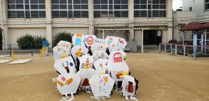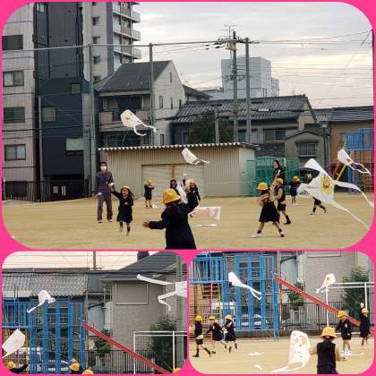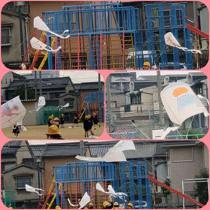 自分で作ったたこをあげてみました。今日は無風状態だったので、運動場を走り回りました。たこあげも体力勝負です。