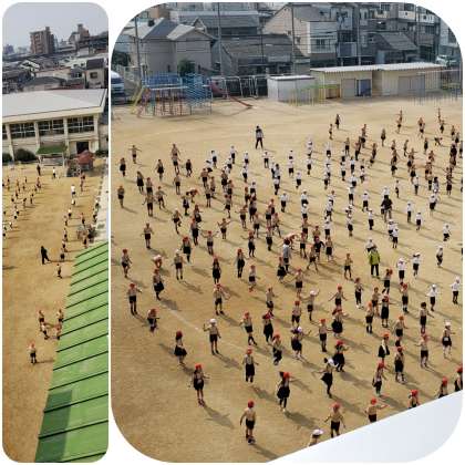 先週のかけ足タイムに続いて、体力づくりの一環として今週から、なわとびタイムを設定しています。みんなの前に出て手本となって跳んでいるの(左側の写真)は運動委員会の人たちです。