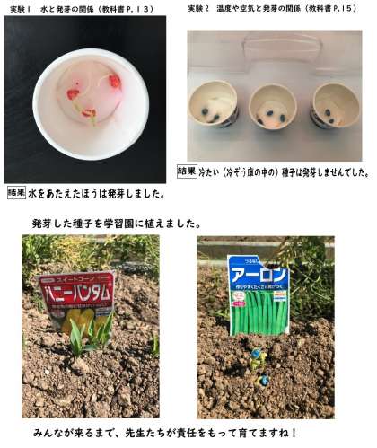 ゴールデンウィーク前に、インゲンマメとトウモロコシの種子がどのような条件で発芽するか実験してみました。