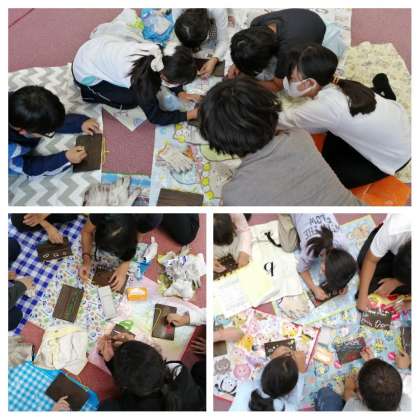 焼板を磨こうとしていると、急な雷雨。続きは屋内の大広間でペイントをしました。やや時間が押し気味です。次は入浴、夕飯です。