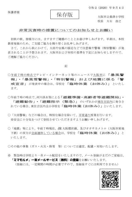 台風10号が非常に強い勢力に発達しながら北上し、6日(日)から7日(月)にかけて日本列島に最接近、上陸の恐れがあるという気象情報が出ております。各ご家庭におかれましては、4月当初にお配りしました「非常災害時の措置についてのお知らせとお願い(保存版)」を今一度ご確認いただき、6日(日)から7日(月)の気象情報には十分、ご注意いただきますようお願いいたします。