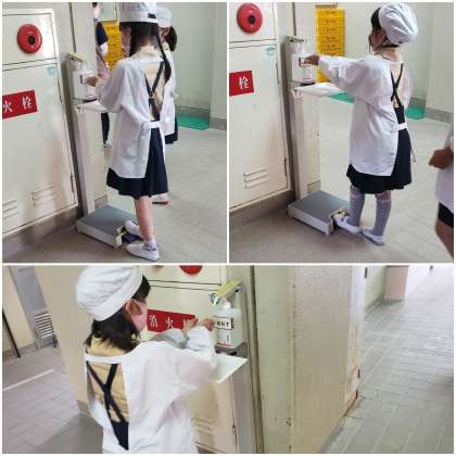 以前は養護教諭と栄養教諭がボトルに入ったジェルタイプの消毒液を一人一人に付けていましたが、運動会以後、足踏み式の消毒剤噴霧台を給食室前に設置しています。