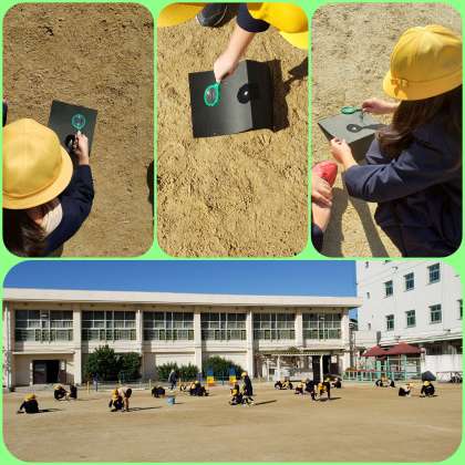 今日も絶好の実験日和です。太陽の光を凸レンズで集めて黒色の画用紙に当て、温度がどうなるかを確かめる実験を運動場で行いました。