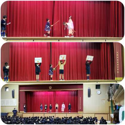 今日の集会は、集会委員の人達による「浦島太郎」の寸劇を見ました。途中クイズを入れながらの楽しい劇でした。