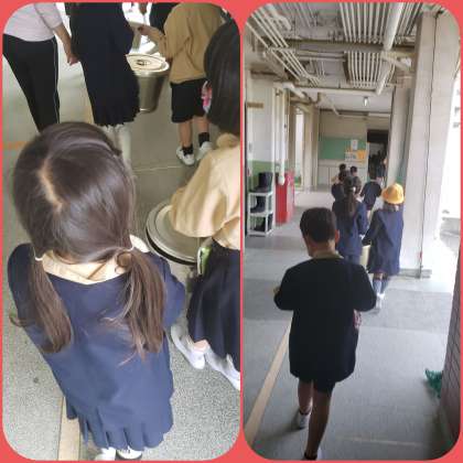 5月になりました。今日から自分たちで給食室まで給食をとりに行きました。本格的に給食当番の始まりです。