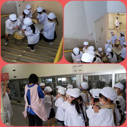 給食を運ぶのもすこしなれてきて、二人の息があってきました。