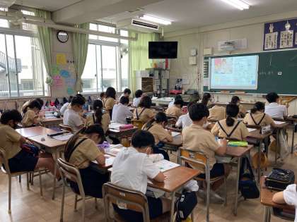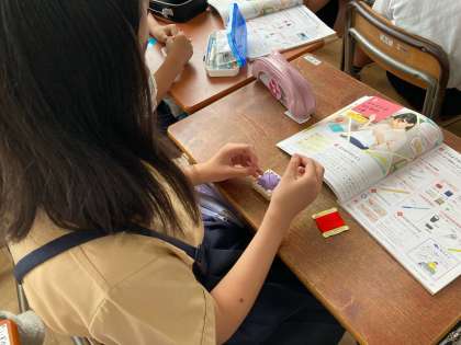 家庭科の学習では、「初めてのソーイング」が始まっています。小さな針の穴に糸を通すのに、苦戦しているようでした。穴と糸の先をよく見て、何度も挑戦していました。