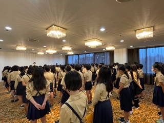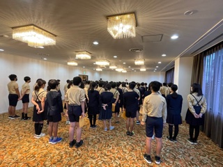 修学旅行2日目朝の会です。昨日とは打って変わって今日の鳥羽方面は雨模様です。朝の会の場所はホテル内の大きなホールになりましたが、この後の活動は水族館ですので天候の影響はほとんどないようです。