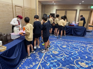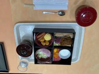 昨日と同じ大ホールで朝食です。写真のメニューの他、パンやジュース、牛乳は自由にいただけます。