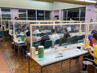昼の活動を頑張ったので、おなかがすきました。待ちに待った夕食です。感染対策で向かいの席との間にはシートが張られ、黙食です。少し残念ですが仕方ないですね。