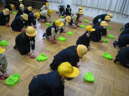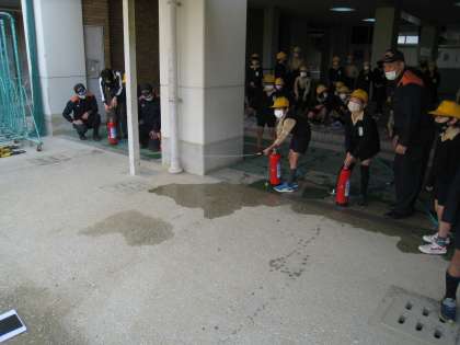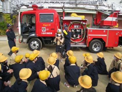 今日は、東住吉消防署と矢田出張所の方に来ていただきました。はしご車の運転席に乗ったり、水消火器の放水をしたりと楽しく活動できました。起震車に乗って、震度7の揺れを体験した時には、地震の怖さを実感しました。今までに学習した、「自分の身は自分で守る」ということを、改めて心に刻むことができました。