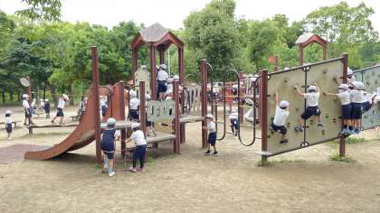 『児童の森』では、アスレチックやボルダリングの遊具で遊びました。