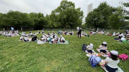 『大芝生広場』に移動後、オリエンテーリングで班活動をしました。