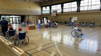車いすの扱い方を学んだ後、一人一人車いすに乗り、自走体験をしました。