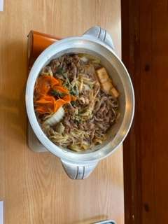 今日のメニューはすき焼きです。コロナ感染防止のため、あらかじめ係の人が取り分けて配膳してくれています。向かいの席との間にシートがあったり、黙食をしないといけなかったりしますが、たくさんの友だちと食べる夕食はやっぱりおいしいです。