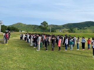 気持ちのよい高原の朝です。朝の集いで体操をして今日の予定、連絡を聞きました。自然体験学習も3日目です。最後までがんばりましょう。