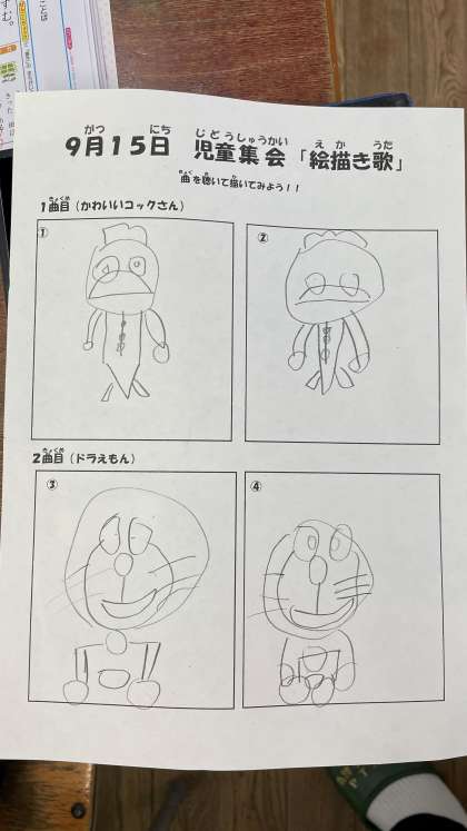 絵描き歌を聞いて、絵を描きます。