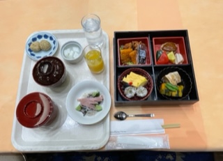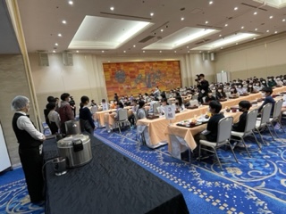 夕食はホテルの大ホールでいただきます。今日はしっかり活動したのでおなかはぺこぺこです。みんな食欲旺盛、たくさんの人が炊き込みご飯をおかわりしていました。