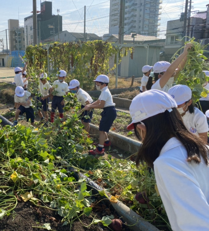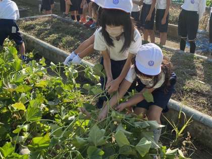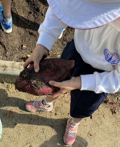 今日は学習園に行ってサツマイモをほりました。みんなで協力して、土の中にあるサツマイモを掘り出しました。自分の両手よりも大きなサツマイモが土の中から出てきて、子どもたちは「とても大きなサツマイモがとれた。」と、とても驚いていました。
