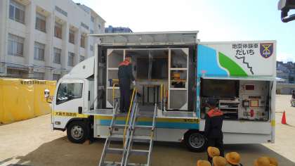 起震車では椅子に座って震度7の揺れを体感しました。揺れの強さにみんなびっくり!必死で手すりに掴まっていました。