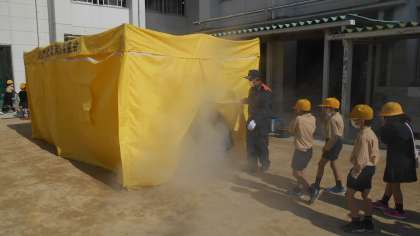 煙テント体験では、前が見えないほど煙で充満した中を落ち着いて行動する方法を学びました。