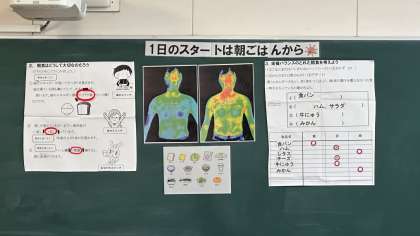 自分で考えた朝食が、黄(エネルギーのもと)赤(体をつくるもと)緑(体の調子を整える)がそろっているか確かめていました。