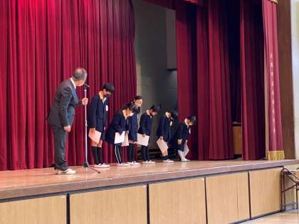 校長先生のお話の後、各種コンクール受賞者の表彰をしました。おめでとうございます!