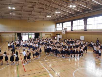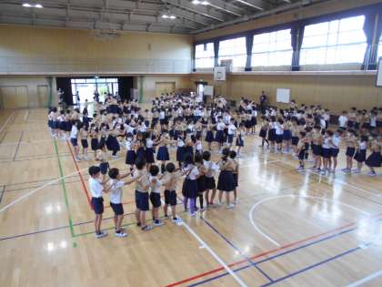 2年生を先頭にペアで列車をつくり、音楽に合わせて移動します。