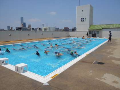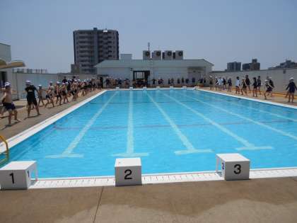準備体操の後に水慣れをしてから学年に応じた学習をします。