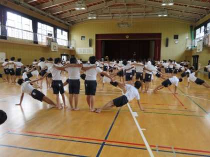 6年生の組立体操の練習風景です。技の出来栄えも素晴らしいのですが、演技の合間合間の姿勢が整っており、移動の動きがてきぱきとして無駄のないのが、より素晴らしい。さすが最高学年です。