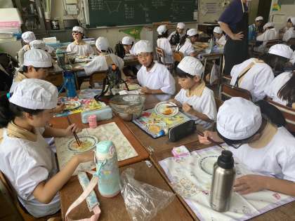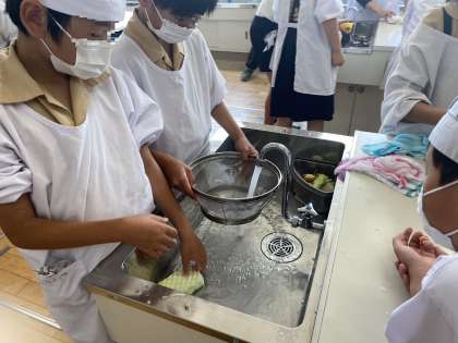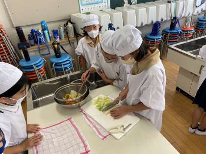 先週水曜、木曜に初めての調理実習をしました。献立は、ゆで野菜サラダでした。班ごとに協力して、にんじん、キャベツ、ブロッコリーを切ったり、ゆでたりしました。自分で作ったゆで野菜サラダは、とてもおいしくできました。林間学習のカレーライス作りに向けて勉強になりました。
