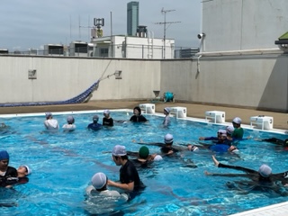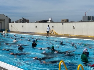 6年生は1学期最後のプール水泳学習で着衣泳をしました。子どもたちは着衣のまま水に入った時の動きにくさや重さ体感しました。万一、海や川などで溺れてしまったときは浮いて救助を待つこと、溺れている人を見つけた時には浮袋の代わりになるものを投げること、またペットボトルを使っての浮き方などを学習しました。