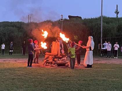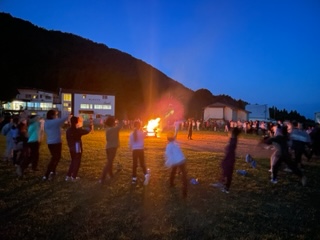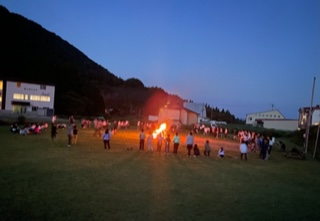「遠き山に陽は落ちて」を歌いハミングをしている時に、鉢伏山から火の神が降りて来て4人の火の子に信頼、友情、意思、希望の火を授けてくれました。キャンプファイヤーが静かに始まりました。