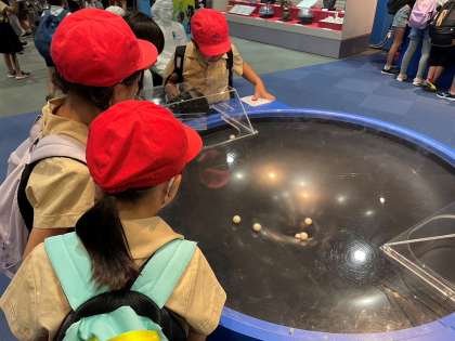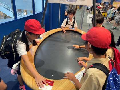 宇宙には「まさつ」がないことを再現する展示では、テーブルの下から空気が出て、まさつをとても少なくすることができ、すべらせた円板がずっと動き続ける様子が確認できました。