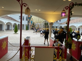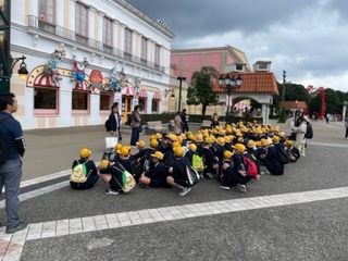 スペイン村に着きました。シベレス広場で集合場所等の確認をして楽しみにしていたアトラクションに。雨が少し降って来たのでカッパを着ての活動になりそうです。