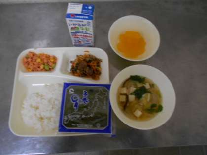 牛肉のコチュジャンいためとさけのカラフルそぼろをごはんと一緒に焼きのりで巻く手巻きご飯、すまし汁、ダイスゼリー、牛乳です。