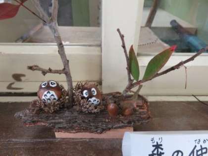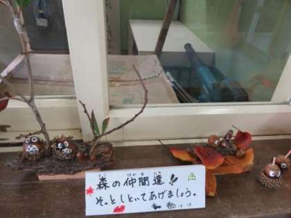 玄関のわきに、そっと森の仲間たちがやってきました。管理作業員さんに、遊び心たっぷりに作っていただきました。みんなは、気づいてたかな?