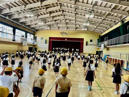 今週はお昼休みに、プール体操の練習が行われていました。たくさんの参加者がいて、みんな楽しそうに参加していました。