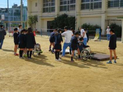 6年生の福祉教育の一環として、総合的な学習の時間を活用して、11月16日(月)に「車いす体験」を実施しました。この取り組みは、大阪市立心身障がい者リハビリテーションセンターのたくさんの職員の方々にご支援をいただいています。車いすの体験を通しての学びや気づきが、人に優しい環境づくりにつながります。