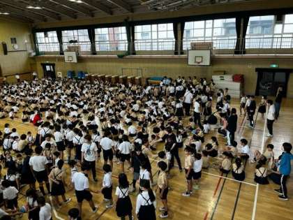 今日は集会委員による児童集会が行われ、ペア学年が協力しボール運び競争をしました。高学年は指を2本低学年は指5本を使うルールでは、運ぶのがとても難しそうでした。