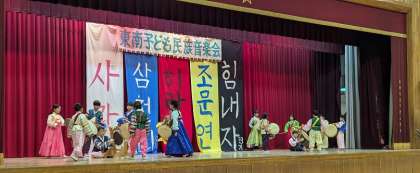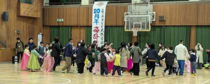 大阪市の東南地域(東住吉区、平野区、阿倍野区)の民族にルーツのある小中学生たちが集まり、楽器の演奏や踊りを発表します。桑津小学校ハヌㇽの会も、毎年参加しています。応援しに来てくれた友だちや家族もたくさんいて、大変盛り上がりました。また、今年の音楽会は記念すべき第20回目ということで、フィナーレにカンガンスルレを参加者全員で踊りました。カンガンスルレは韓国朝鮮の伝統的な民族遊びで、手を取り合って大きな円を描きながら集団で踊ります。みんなで大きな一つの円を作っていると、心も一つになったような気がしました。