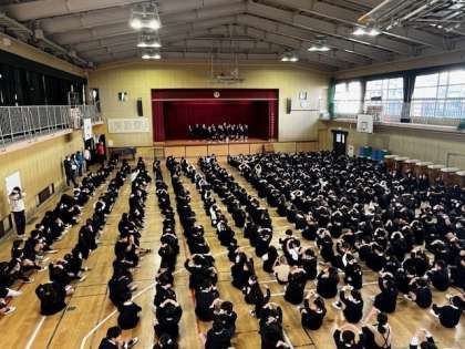 給食委員会が給食週間(1月24日〜1月30日)の児童集会を行いました。80年前に戦争が終わり外国からの支援物資により、給食が再開されたことから設定されました。集会では、給食や食べものについての〇×クイズを、ひとり一人〇×を体で表現して答えました。最後に食器や食缶等を丁寧に使うことをアピールして終わりました。