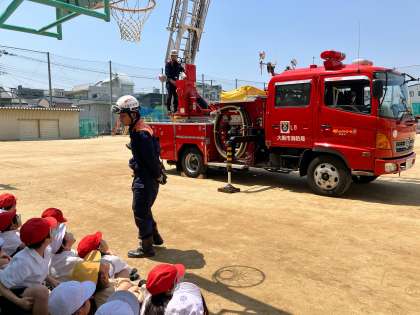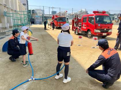 東住吉消防署の方や東住吉区役所の方に来ていただき、救命について、消火器の使い方、火災や煙中での行動の仕方、地震が発生したときの避難行動のとり方などを教わりました。