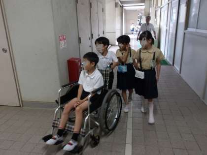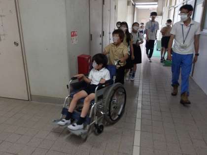 介助体験では、班で声をかけ合って校舎内を通行しました。