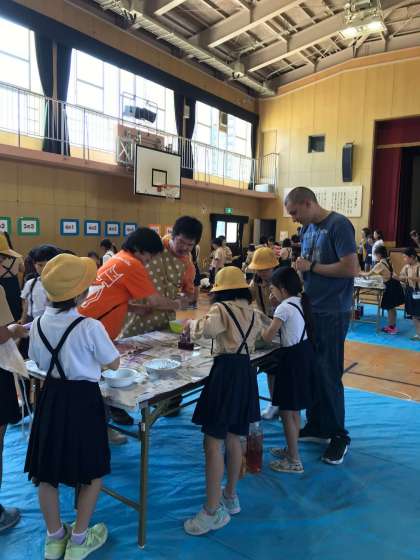 講堂での和紙染め、運動場でのお店。