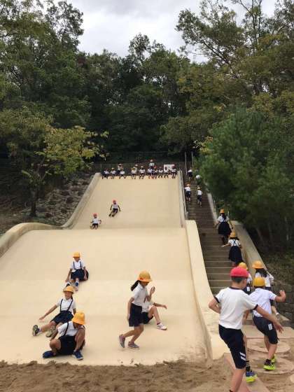 お弁当、おやつを食べて、公園で遊んでいます。もう、汗だくです。
