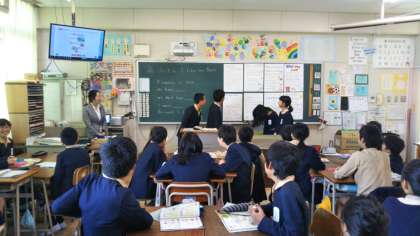 写真は、6年生での様子です。授業時間中、担任教師はできるだけ日本語を使わず英語だけで進めます。高学年には週1時間、C−NET(ネイティブの講師)とともに、歌を歌ったり、ゲームをしたりしながら、英語に慣れ親しみ、簡単な会話などに取り組んでいます。