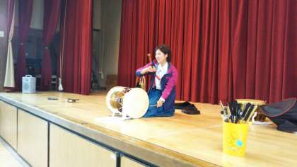 民族講師のソンセンニムにチャンゴのたたき方を教えていただきました。