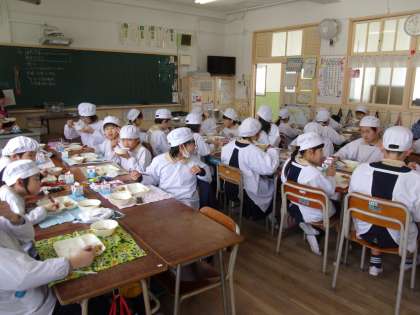 桑津小学校では、「交流給食」と名付けて、時にはペア学年が一緒に給食を食べています。ペア学年とは、2学年ずつの異学年で、様々な交流活動を行っています。