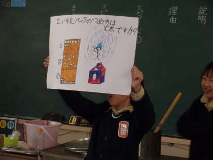 今回はペア学年での給食です。高学年が、給食に関するクイズを出してくれます。写真の様子は5年生と3年生の交流給食の様子です。